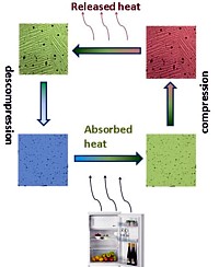 Die Erforschung von Materialien, die nahe der Raumtemperatur große kalorische Effekte aufweisen, ist besonders für die Entwicklung neuer Kühlsysteme interessant, wo bislang magnetokalorische Materialien als die die erfolgversprechendsten Kandidaten galten, deren Temperatur sich unter dem Einfluß eines externen magnetischen Feldes ändert (s.d.).