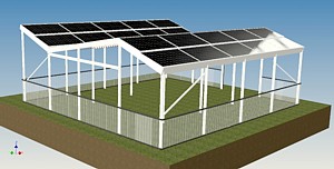 Das Konzept von SUNfarming basiert auf einem hoch aufgeständerten Solarpark, bei dem die Räume zwischen den semintransparenten Modulreihen mit Gewächshausplatten überdacht werden. Auf diese Weise entsteht eine große, landwirtschaftlich nutzbare Fläche, die mit weiteren Platten umzäunt wird. Dadurch ist die Fläche gegen das Auswaschen bei starken Regenfällen, aber auch vor Wildtieren geschützt – während die oberen zwei Drittel der Umzäunung mit Netzen umspannt sind, um die landwirtschaftlichen Kulturen vor Vögeln zu schützen. Damit könnte das Konzept schon fast den Solar-Gewächshäusern zugeordnet werden.
