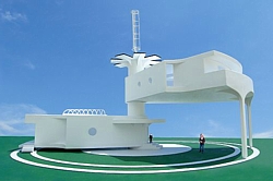 In der überbordenden Fülle seiner Entwürfe lassen sich auch diverse rotierende Gebäude und Konstruktionen finden. Im Sinne der hier vorgestellten Drehhäuser möchte ich beispielhaft sein Orbiting Eco House nennen, das aus zwei getrennten Strukturen besteht. Der untere Teil enthält Platz für Bad und Küche, während im aufgeständerten oberen Teil Studios, Büro- oder Wohnräume untergebracht sind.
