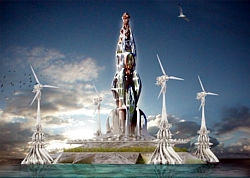 Die einzelnen Elemente des schwimmenden Staates bestehen aus knospenartigen Hochbauten, die sich inmitten einer künstlichen Lagune bis zu 1.000 m hoch in den Himmel recken, während der Kiel gleichzeitig bis in 1.000 m Wassertiefe reicht. Leider wird über die Art der dafür ins Auge gefaßten Energieversorgung nichts gesagt.