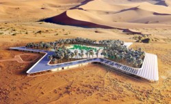 Herzstück des Oasis Eco Resort in Liwa, der südlichen Region der VAE, bildet ein Tiefbrunnen, aus dem frisches Wasser in einen Teich gepumpt wird, um den herum ein Biotop entstehen soll. Um dieses herum wird das Gebäude des Hotels sternförmig aufgefächert. Dieses ist natürlich nicht für den Massentourismus geplant – weshalb es lediglich 84 miteinander verbundene Luxussuiten unterschiedlicher Art besitzt, deren Außenterrassen wahlweise einen Ausblick auf das Biotop oder auf die Wüste bieten.