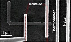 Dafür wird in den Experimenten die eine Seite des gebogenen magnetischen Nanodrahts aus einer Nickel-Eisen-Legierung mit einem elektrischen Heizer erwärmt und über zwei Kontakte die Seebeck-Spannung gemessen. Eine Einkerbung des Drahtes erlaubt es, zwischen den Kontakten genau eine einzelne magnetische Domänenwand einzufangen und den daraus resultierenden Unterschied der Seebeck-Spannung zu bestimmen. Dabei zeigt sich, daß der Domänenwand-Magneto-Seebeck-Effekt zu einer Erhöhung der Thermospannung des Nanodrahtes führt.