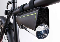 Das hier abgebildete zweite Modell RYDE wird unter den Stahlrahmen eine Rads montiert (225 $). Die Apparatur, an deren Unterseite die eigentliche Trinkflasche eingeschraubt wird, nimmt an der Vorderseite den Fahrtwind auf, besitzt seitlich angebrachte Solarzellen und kann ebenfalls etwa einen Tropfen Wasser pro Minute liefern – allerdings nur, wenn die Außentemperatur mindestens 20°C erreicht.