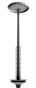Bei diesem Entwurf handelt es sich um eine Solarleuchte, deren Kranz aus PV-Paneelen sich in die Form eines liegenden Vielblatt-Windrotors umwandelt, sobald es dunkel wird.