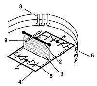 Die Beine der Stützstruktur enden auf zwei unabhängigen Achsen, die auch als die Naben für den Generatorrotor dienen, während der äußere Rand des Generator-Rotors mit der Stützstruktur verbunden ist, um den Drehmoment vom Turbinenrotor zum Generator zu übertragen.