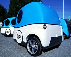 Bevor jedoch tatsächliche Schritte in Richtung einer Produktion unternommen werden, zaubert Nègre das nächste Kaninchen aus dem MDI-Hut, das diesmal – zeitgemäß – AirPod heißt. Ob man das in knalligen Farben vorgestellte Fahrzeug allerdings als ‚Auto’ bezeichnen kann, ist fraglich. Es ähnelt äußerlich dem ‚Hamster-Auto’ von Toyota, das ich am Ende des Kapitels über die Muskelkraft vorgestellt habe, bzw. den Elektro-Cabs der Firma ULTra-System, die auf dem Internationalen Flughafen Heathrow bereits eingesetzt werden und auch für das Masdar-Projekt geplant sind (s.d. sowie unter Podcars).